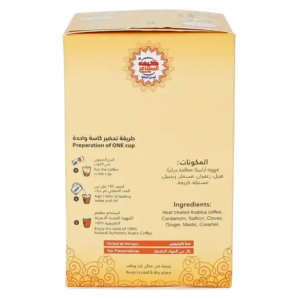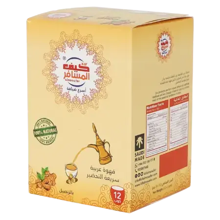 Almosafer Instant Arabic Coffee with Ginger 12 x 5g combines the authentic taste of traditional Arabic coffee with the warming essence of ginger. Each sachet delivers a perfectly balanced cup that’s aromatic, flavorful, and convenient to prepare.
