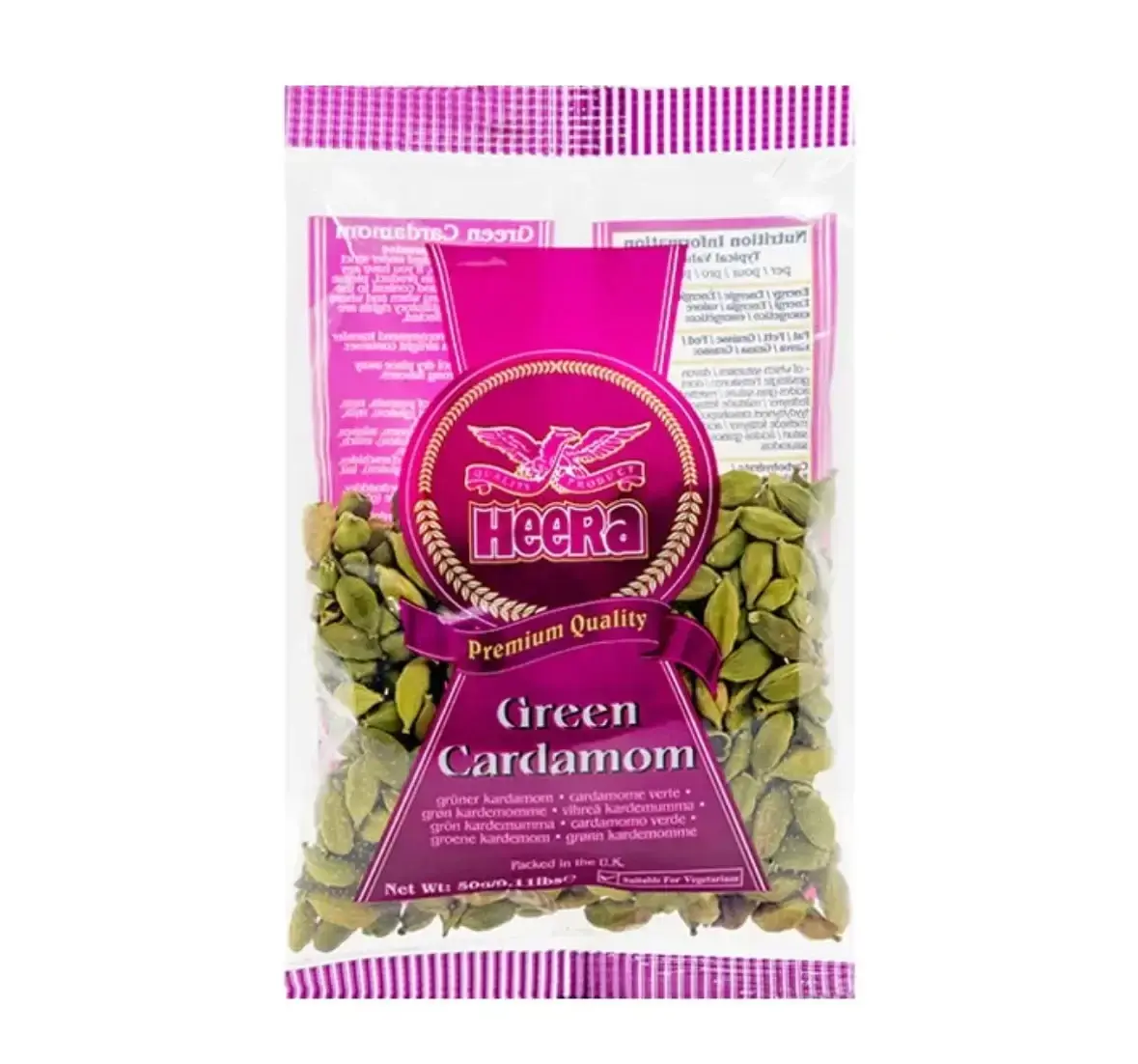 Heera Green Cardamom 50 g — Premium whole green cardamom pods with a sweet, floral aroma and warm, citrusy notes. A versatile spice essential for both sweet and savoury cooking, perfect for flavouring chai, desserts (like kheer or custards), biryanis, curries, spice mixes, and more