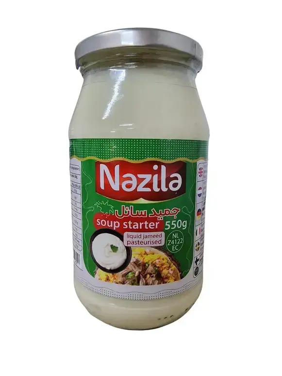Nazila Soup Starter 550g (Liquid Jameed) is a ready-to-use base made from fermented dried yogurt, offering the rich, tangy flavor of authentic jameed.