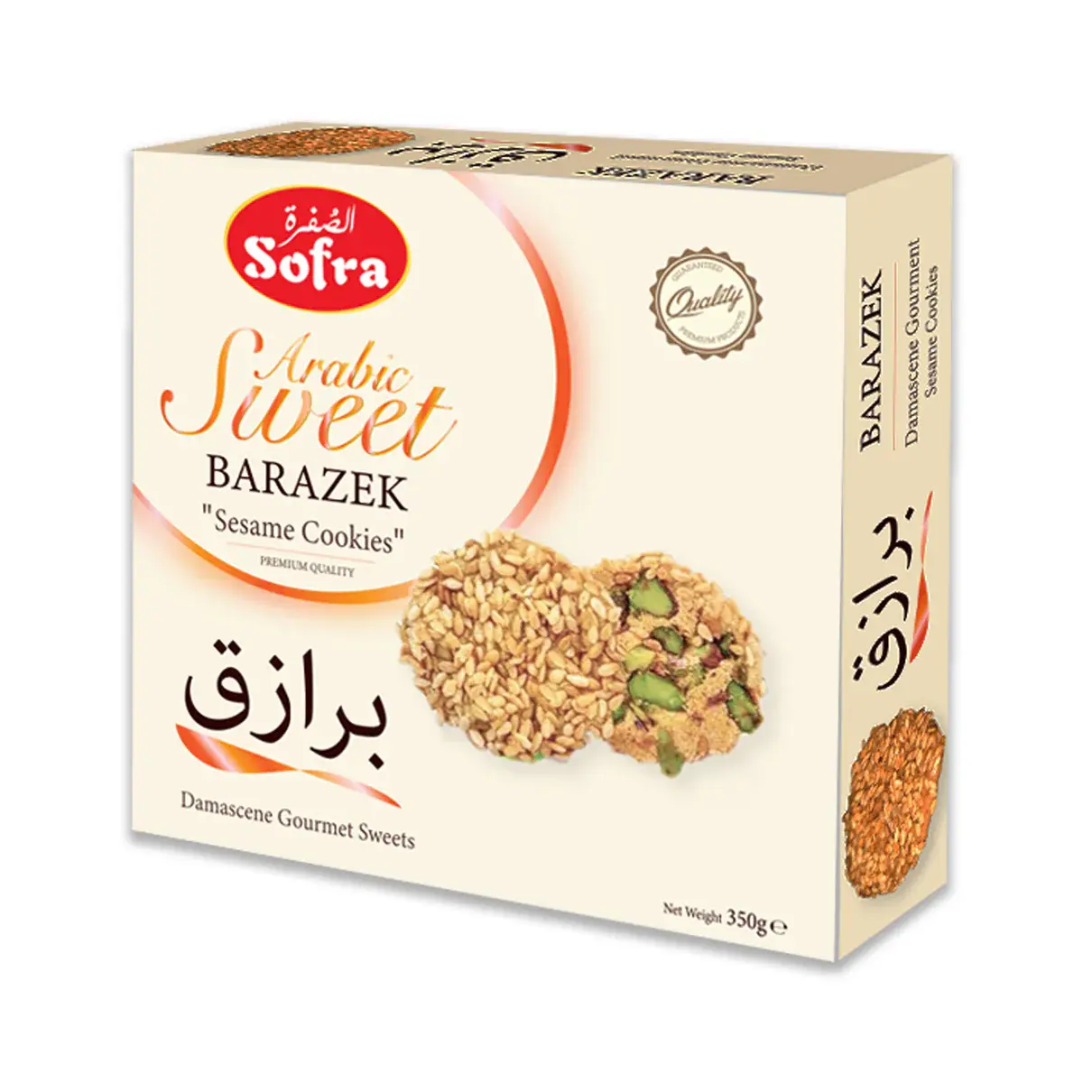 Indulge in the authentic flavors of the Middle East with Sofra Arabic Sweet Barazek Sesame Cookies. These traditional cookies are baked to a crisp, coated with toasted sesame seeds on one side and topped with crushed pistachios on the other, creating a perfect balance of nutty sweetness and crunch.